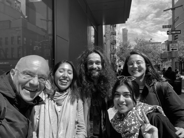 The Making of Corona Plaza film team, from right to left: Benazir Baig, Daniela Fernandez Lopez, Lukas Kernke, Mae Francke Rojo, and Miodrag Mitrašinović. New York City, April 2024.